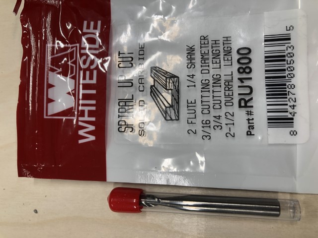 Spiral Up cut 011 April 19, 2024 WhiteSide QR 011 Spiral Up cut 2 FLUTE 1/4 SHANK 3/16 CUTTING DIAMETER 3/4 CUTTING LENGTH 2-1/2 OVERALL LENGTH Part# RU1800